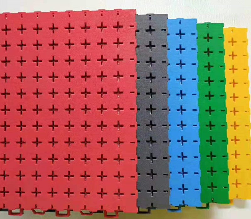 由于產(chǎn)品表面為網(wǎng)狀鏤空結(jié)構(gòu),地板的底部有水槽,所以清洗地板或雨后均無(wú)積水存在,保證了運(yùn)動(dòng)地板的利用率。